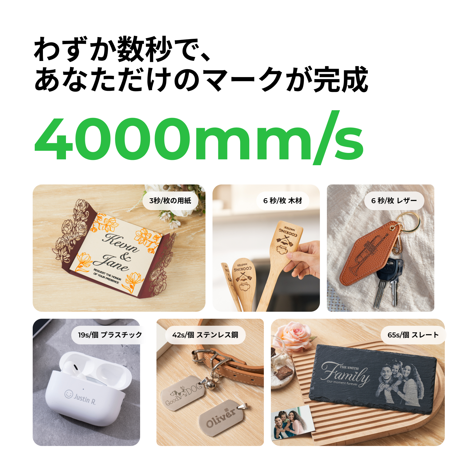 • 彫刻速度: xTool F1 LiteとF1の最大彫刻速度は4000mm/sで、レーザー加工機の中でもトップクラスの速さを誇ります。
