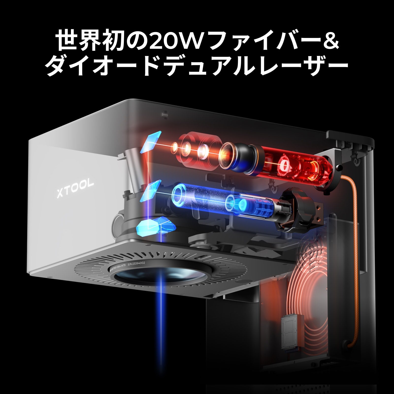 F1 Ultraはデュアルレーザーです。20Wのファイバーレーザーと20Wの力ルボブルーダイオードレーザーを搭載