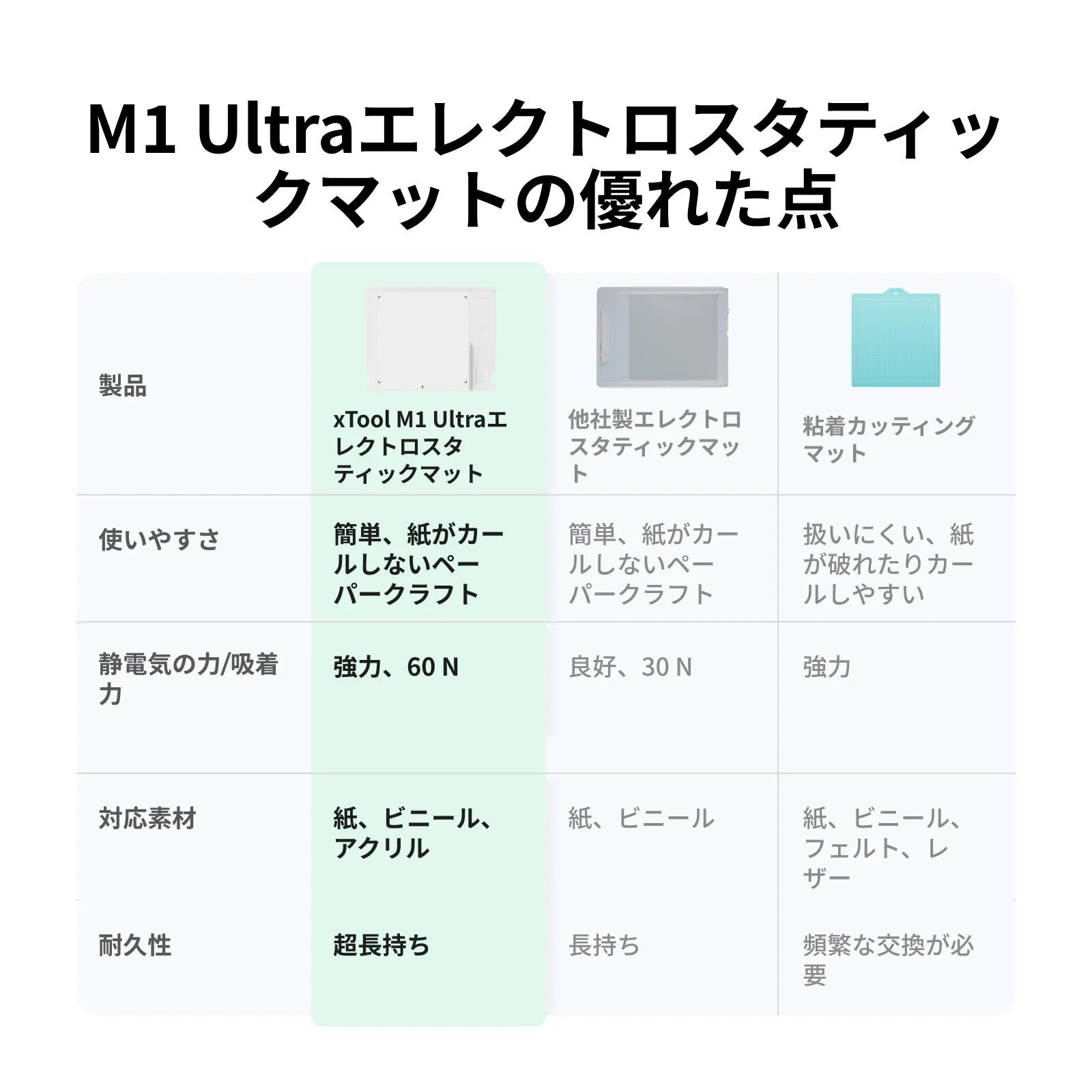 静電マットは、従来の粘着式カッティングマットのように粘着剤で素材を固定するのではなく、静電気の力でしっかりと押さえます。これにより、紙のカールや破れを防ぎ、スムーズなクラフト作業ができ、素材の無駄も減らせます。さらに、粘着式マットのように粘着力が時間とともに弱まることがなく、耐久性が高く、交換コストも抑えられます。