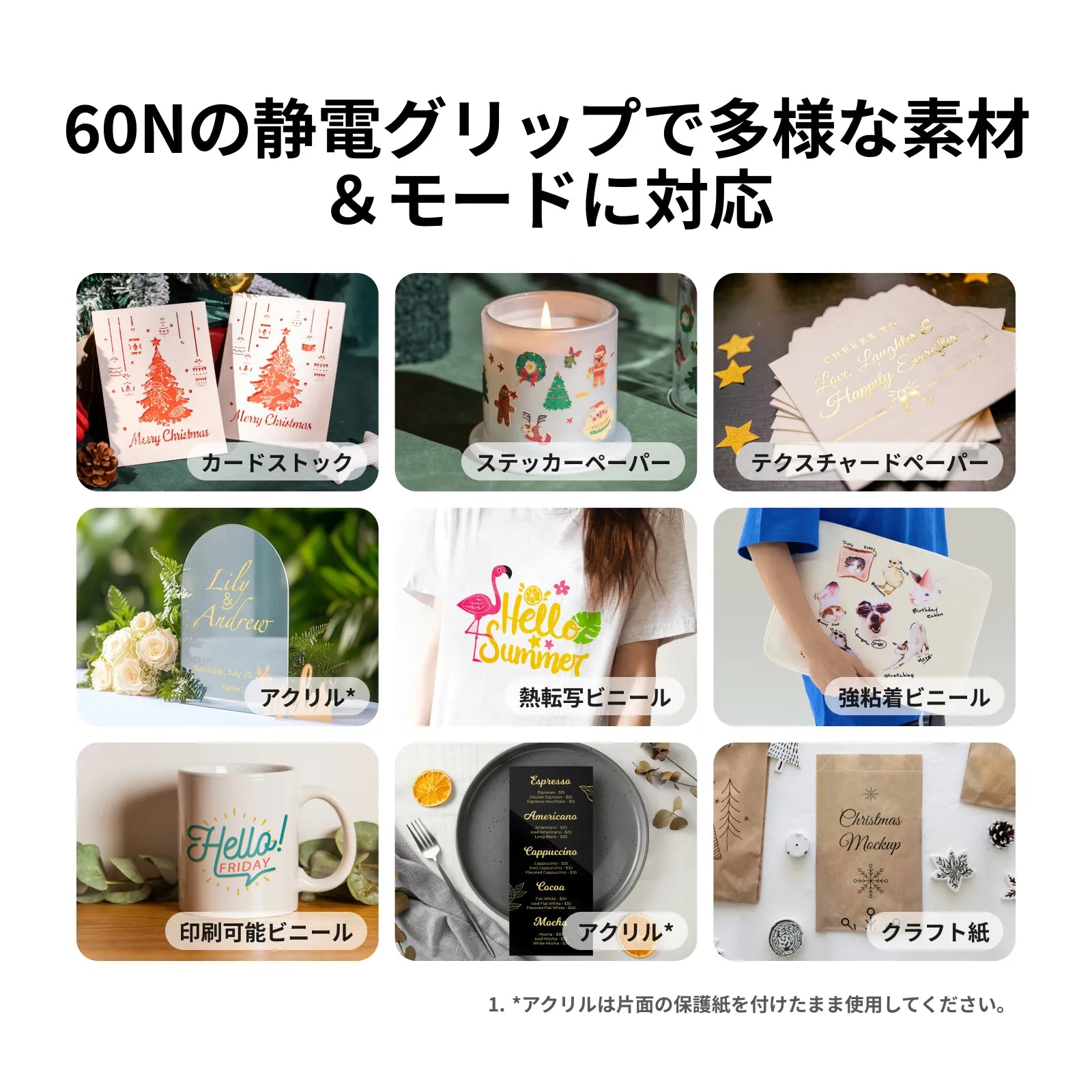強力な静電気力でアクリル(保護紙付き)をしっかりと固定し、インクジェット印刷やフォイル転送が可能です。招待状やサインのクラフトに最適です。