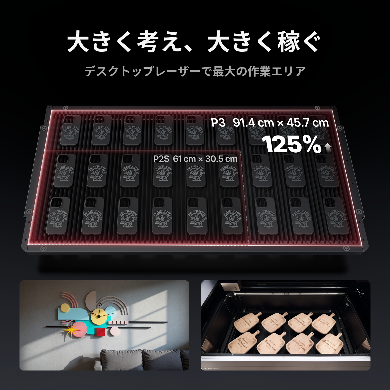 • 作業エリア:xTool P3の標準作業エリアは広々とした915 mm x 458 mmです。これはP2Sの約2.3倍の面積で、大規模なプロジェクトやより効率的なバッチ生産を簡単に扱うことができます。さらに、長尺材料の処理が必要なプロジェクトには、P3はオプションのインテリジェントコンベヤーフィーダーと互換性があり、ほぼ任意の長さの材料で作業する能力を解放します。