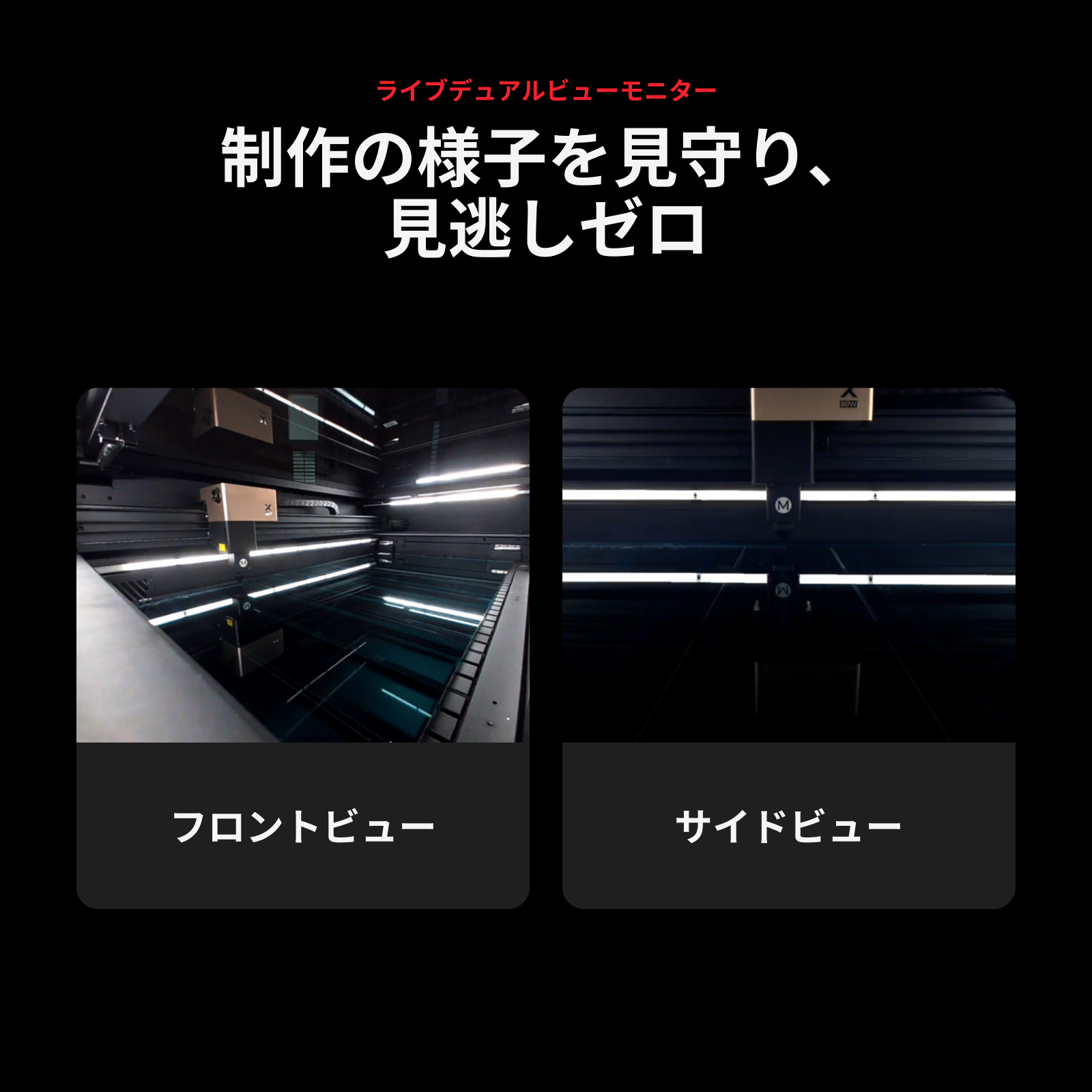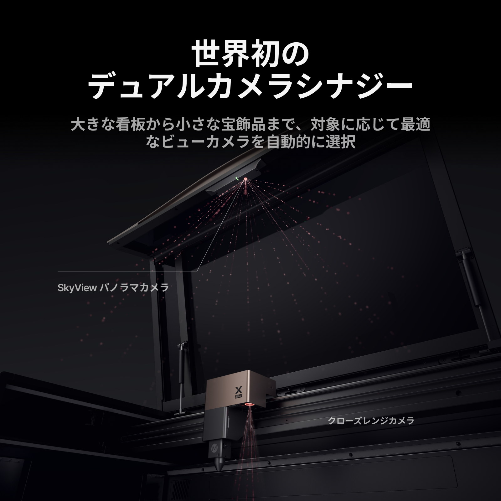 • オートポジショニング:単に蓋を閉じるだけです。高解像度のデュアルカメラシステム(16MPスカイビューカメラと近距離詳細カメラ)が、作業スペース全体のライブ画像を瞬時にキャプチャします。これにより、ソフトウェア内で材料にデザインを正確に配置できます。