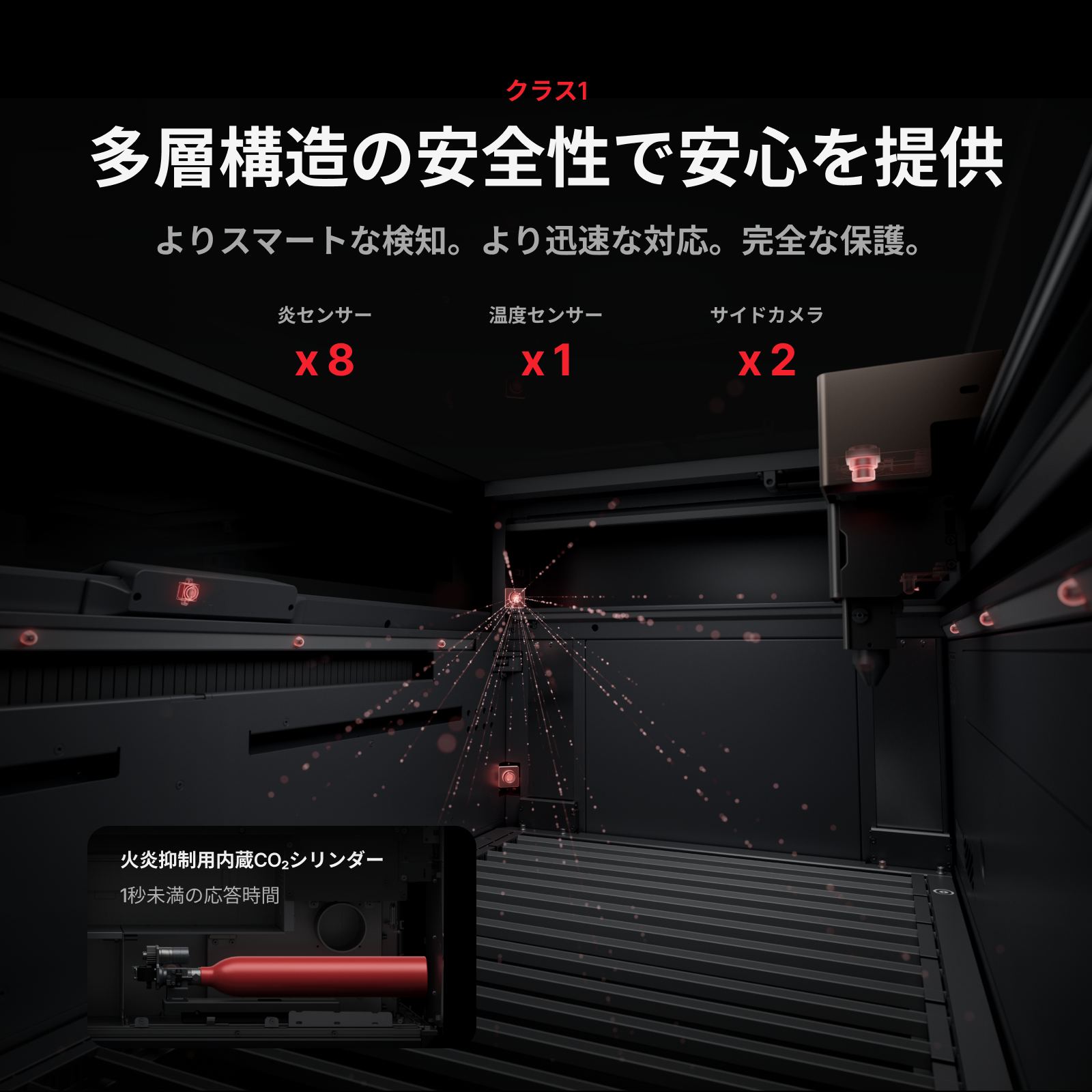 • P3は安全性において大きな飛躍を遂げ、認定されたクラス1レーザー安全評価を達成していますが、P2Sはクラス4デバイスです。この最高レベルの安全性は、多層システムによって実現されています。P3は、8つの赤外線(IR)センサー、温度センサー、側面カメラを高度な視覚アルゴリズムと組み合わせたアップグレードされた高精度認識システムを統合しています。一方、P2Sはカメラ認識に依存しています。さらに、P3は標準で内蔵のCO₂アクティブ消火システムを備えており、これはP2Sで別途購入が必要なオプションの火災安全セットを必要とする重要な機能です。