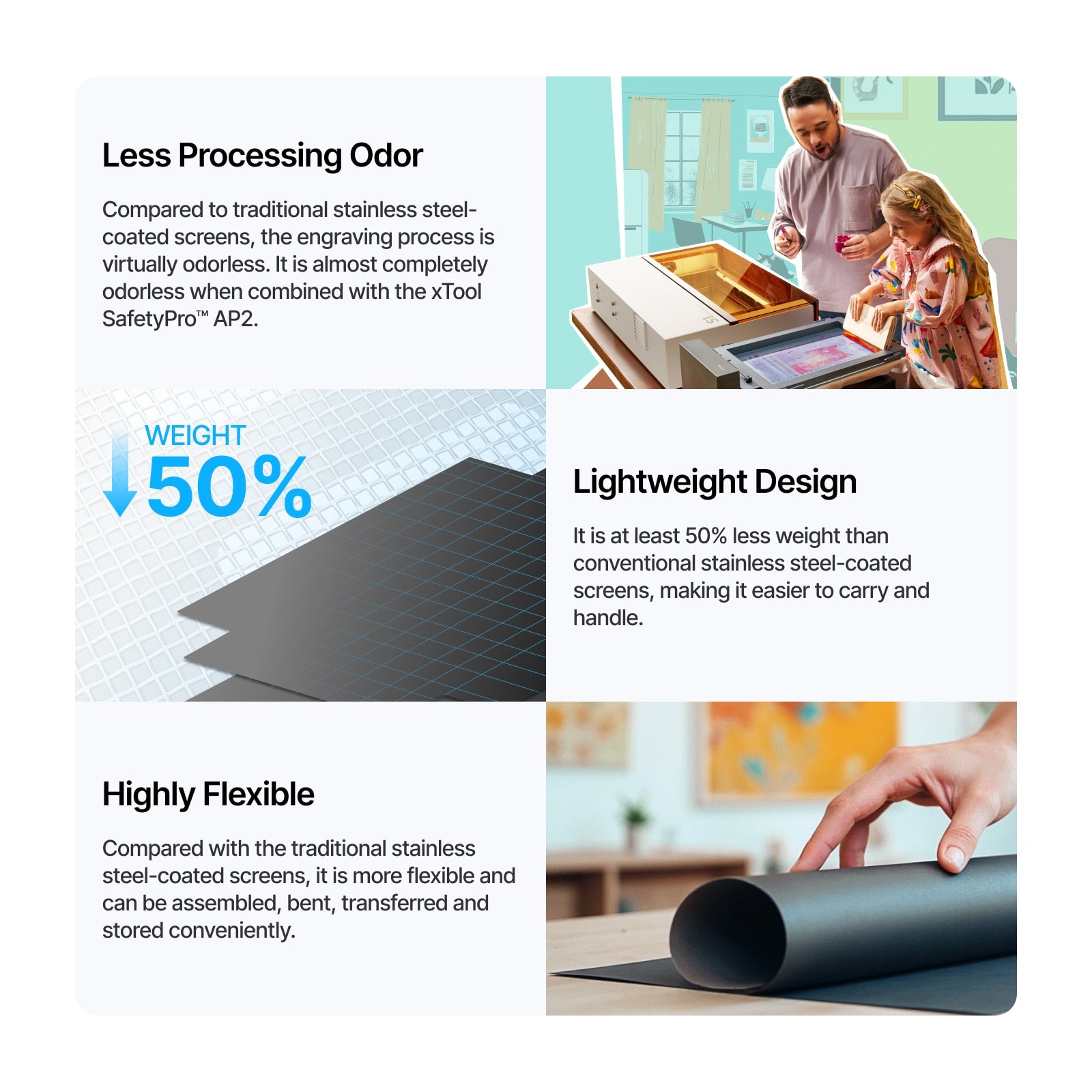 - 彫刻中、ポリエステル高速彫刻スクリーンはほとんど匂いを発しません。xTool SafetyPro™ AP2と併用することで、ほぼ無臭の快適な作業環境が実現し、生産性が向上します。