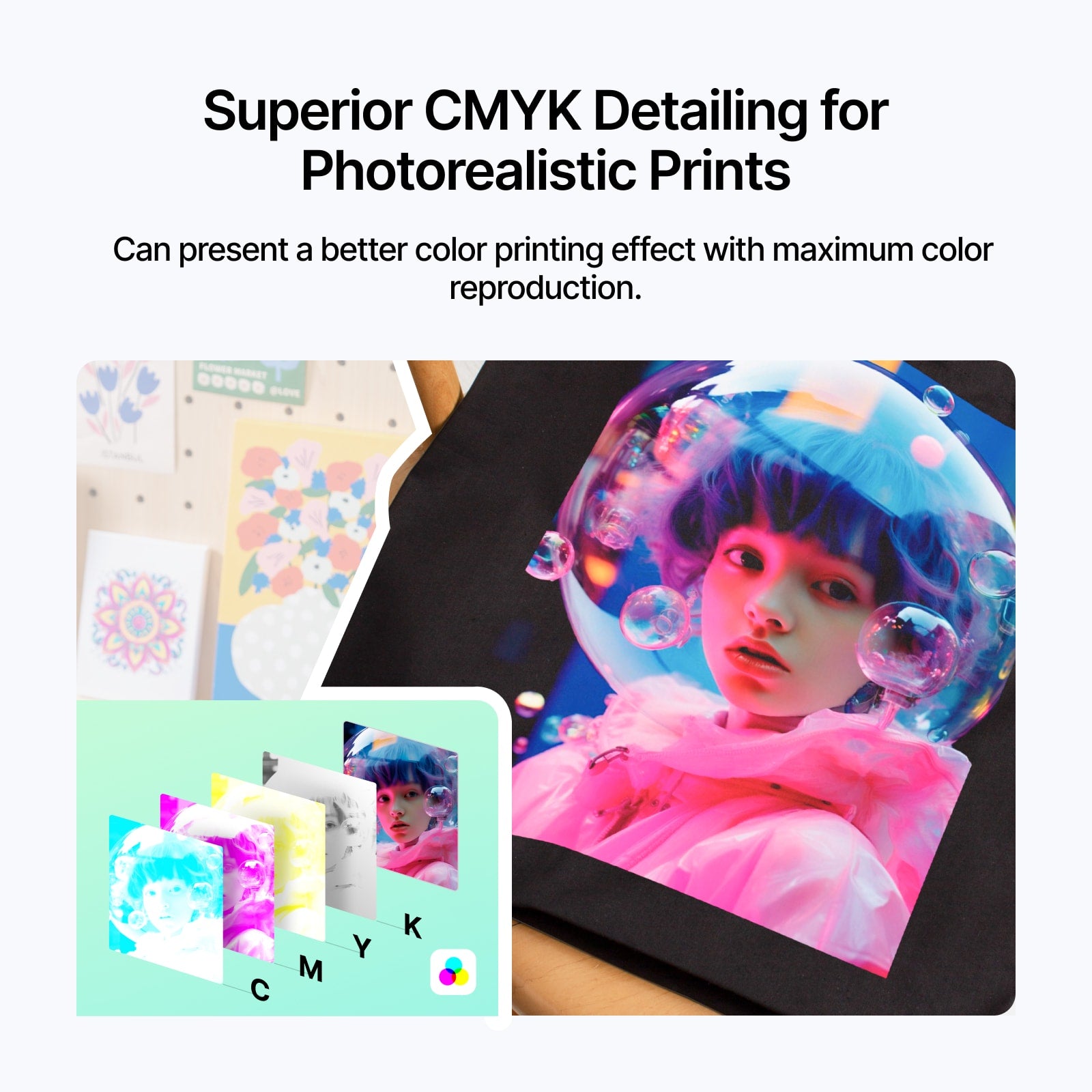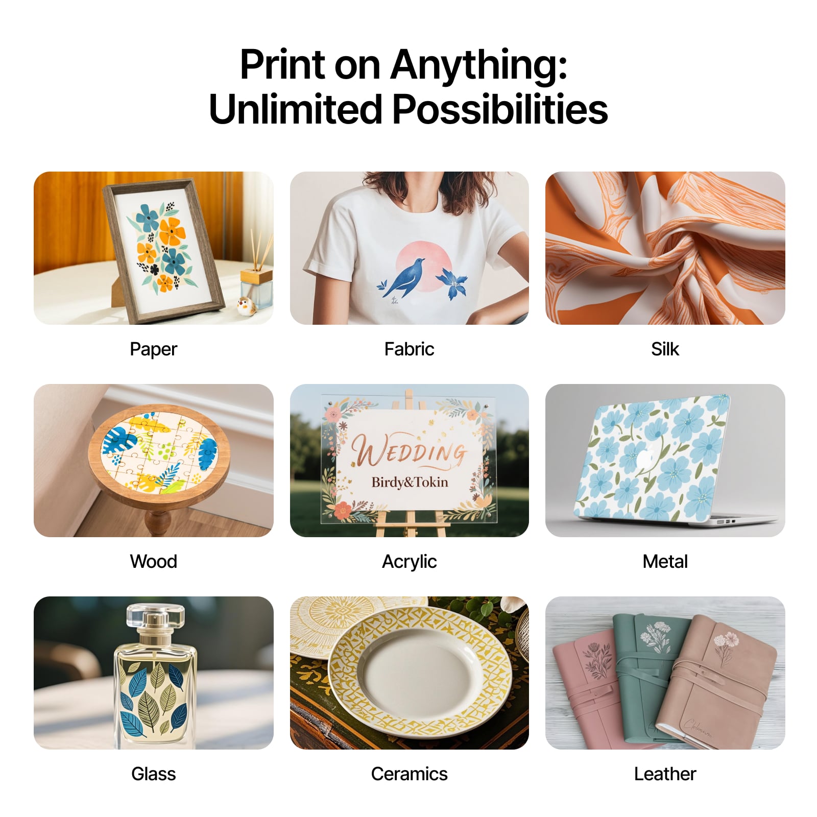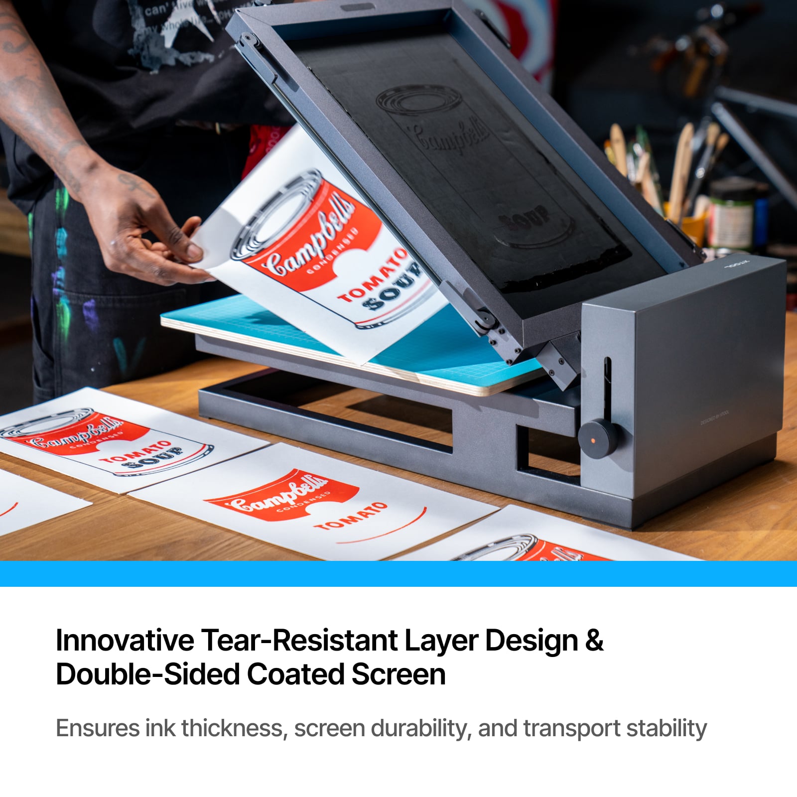 - コーティングされたスクリーンは当社の鮮やかなインクと組み合わせることで、布、紙、金属、シルク、アクリル、ガラス、セラミック、木材などさまざまな素材に対応し、美しい仕上がりを実現します。Tシャツや約28cm × 35.6cmのキャンバス、約29.2cm × 40.6cm以下のアイテムなどの印刷に使用可能です。