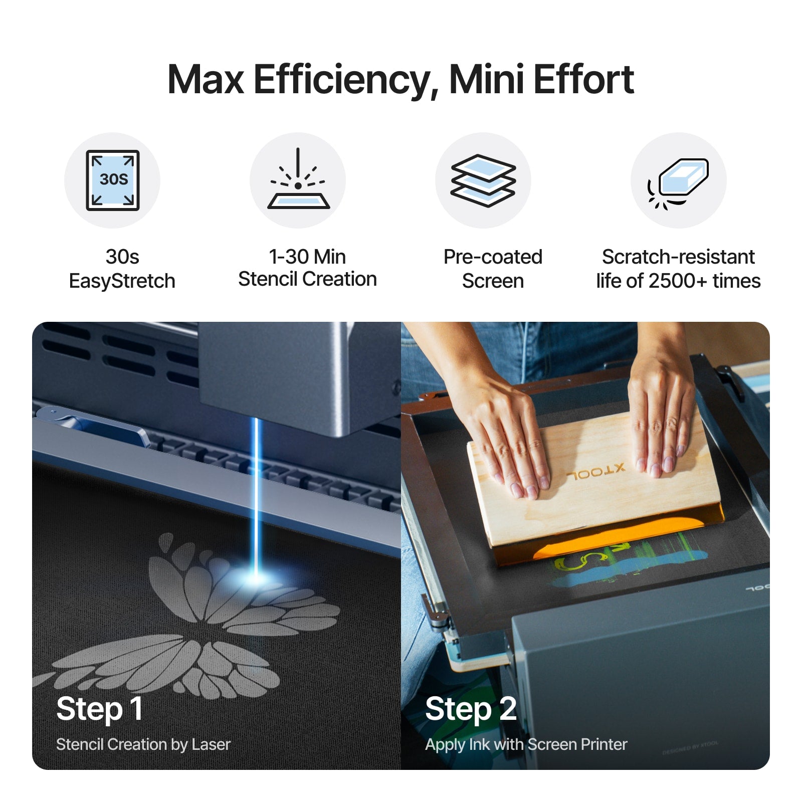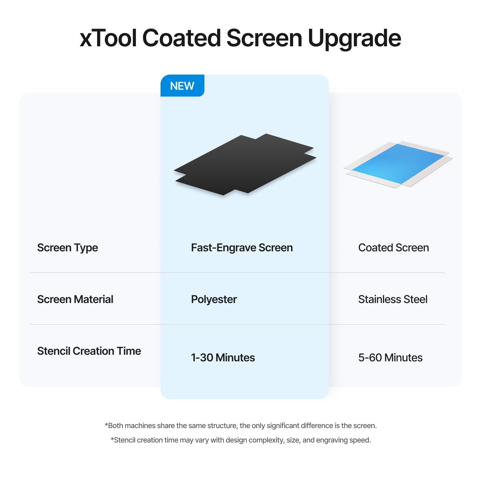 - 効率的な加工:同じxTool機種と出力であっても、ポリエステル高速彫刻スクリーンは従来のスクリーンボードよりも加工時間が大幅に短く、平均で1~30分(従来は5~60分)で済みます。これにより生産性が大幅に向上し、印刷作業をより迅速に完了できます。