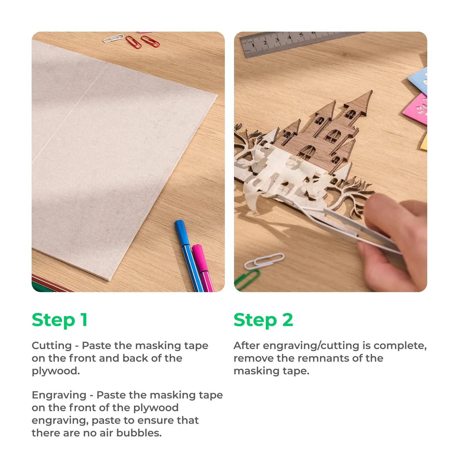 - 使用手順:合板加工の前に使用する必要があります。合板をカットする場合は、まず両面にマスキングテープを貼り、その後xTool機械でレーザーカットしてください。合板に彫刻をする場合は、彫刻する表面にマスキングテープを貼り、その後xTool機械でレーザー彫刻してください。マスキングテープを貼る際に気泡が入らないようにすると、最良の結果が得られます。