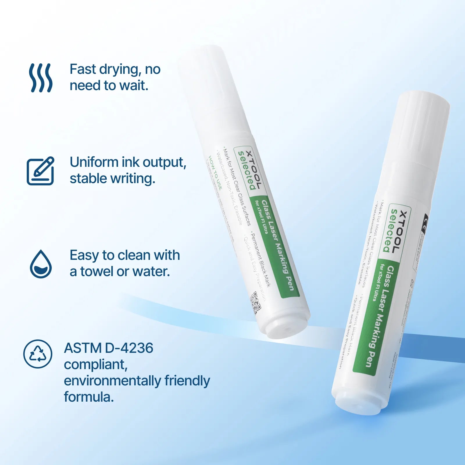 高精度でガラス専用に設計されたマーキングペンです。塗布時のインクは白色ですが、xTool F1 Ultraでレーザー彫刻を行うと、鮮明で永久的な黒色の模様が残ります。