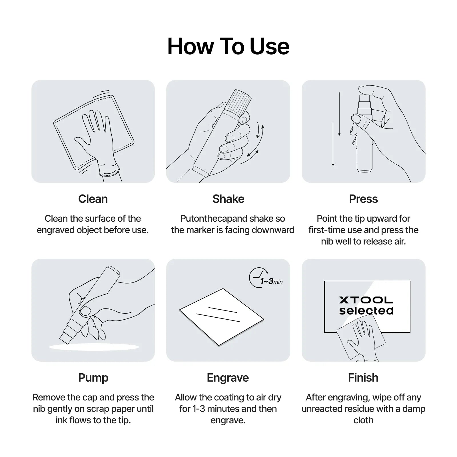 処方は安全かつ環境に優しく、ASTM D-4236規格に準拠しています。 - 注意事項:使用前に彫刻対象物の表面を清潔にしてください。初回使用時はペン先を数回押してインクを出してください。