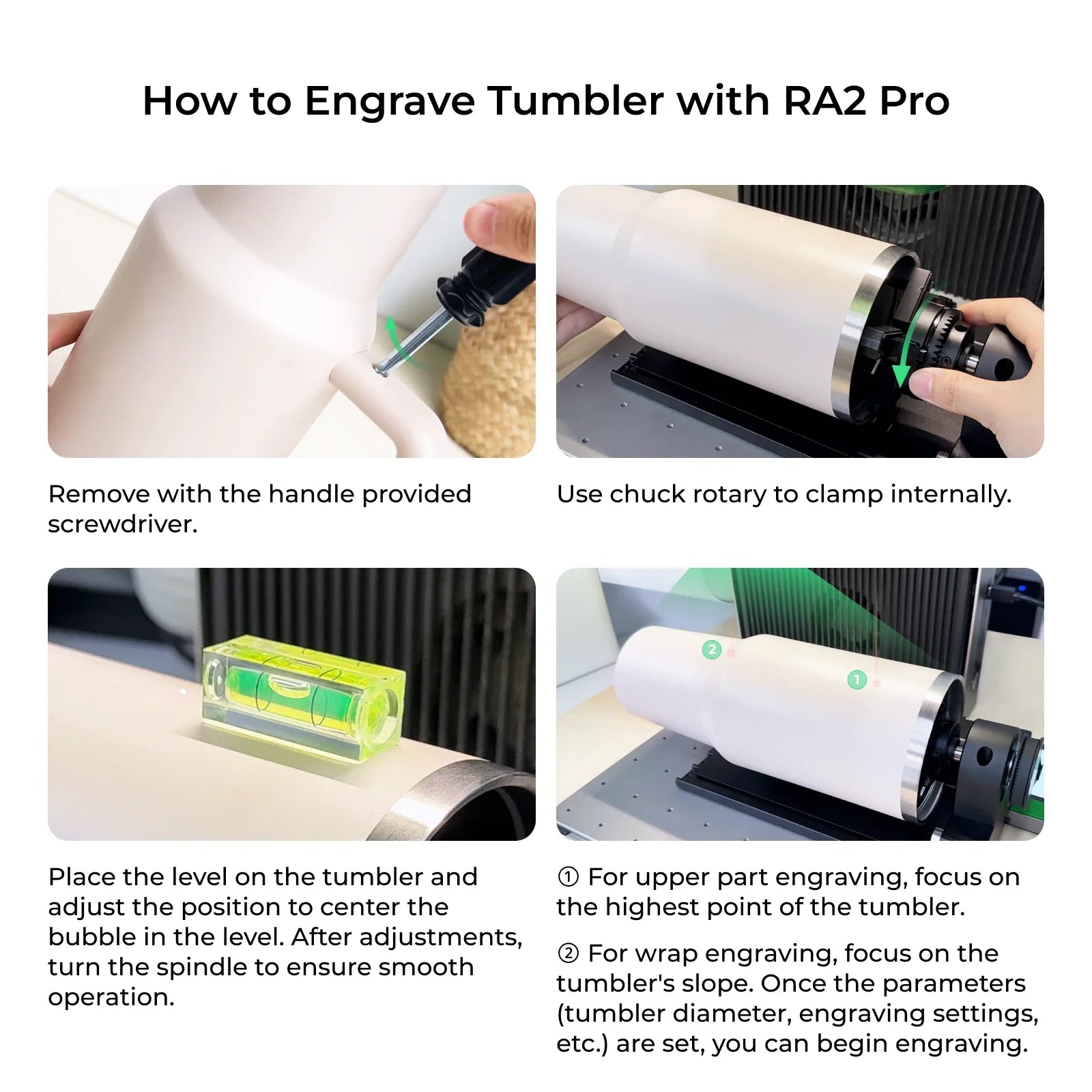 パソコンごとの色味の違いにより、実際の色と画面上の色には多少の誤差が生じる場合があります。広範囲のレーザー彫刻を行う際には、付属のドライバーを使ってハンドルを取り外し、回転用アタッチメントを併用することをおすすめします。熱い飲み物を入れてストローを使用する際は、やけどに十分ご注意ください。