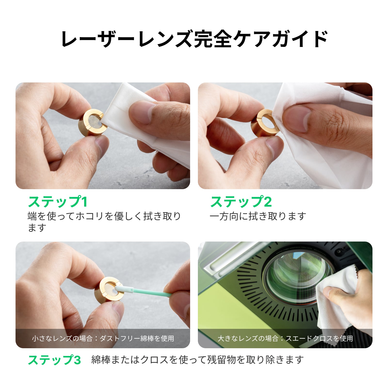 綿棒&クロスセットには、ホコリの出ない綿棒200本と再利用可能なスエードクロス20枚が含まれています。