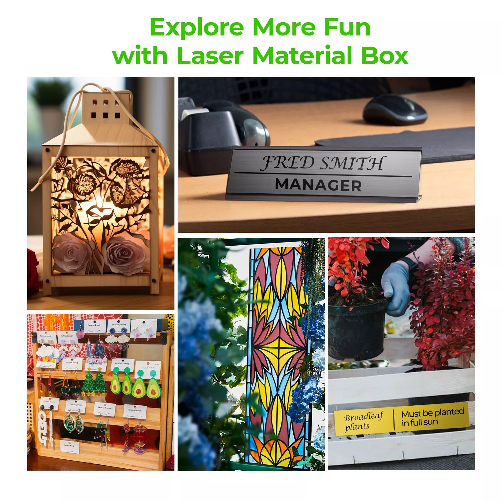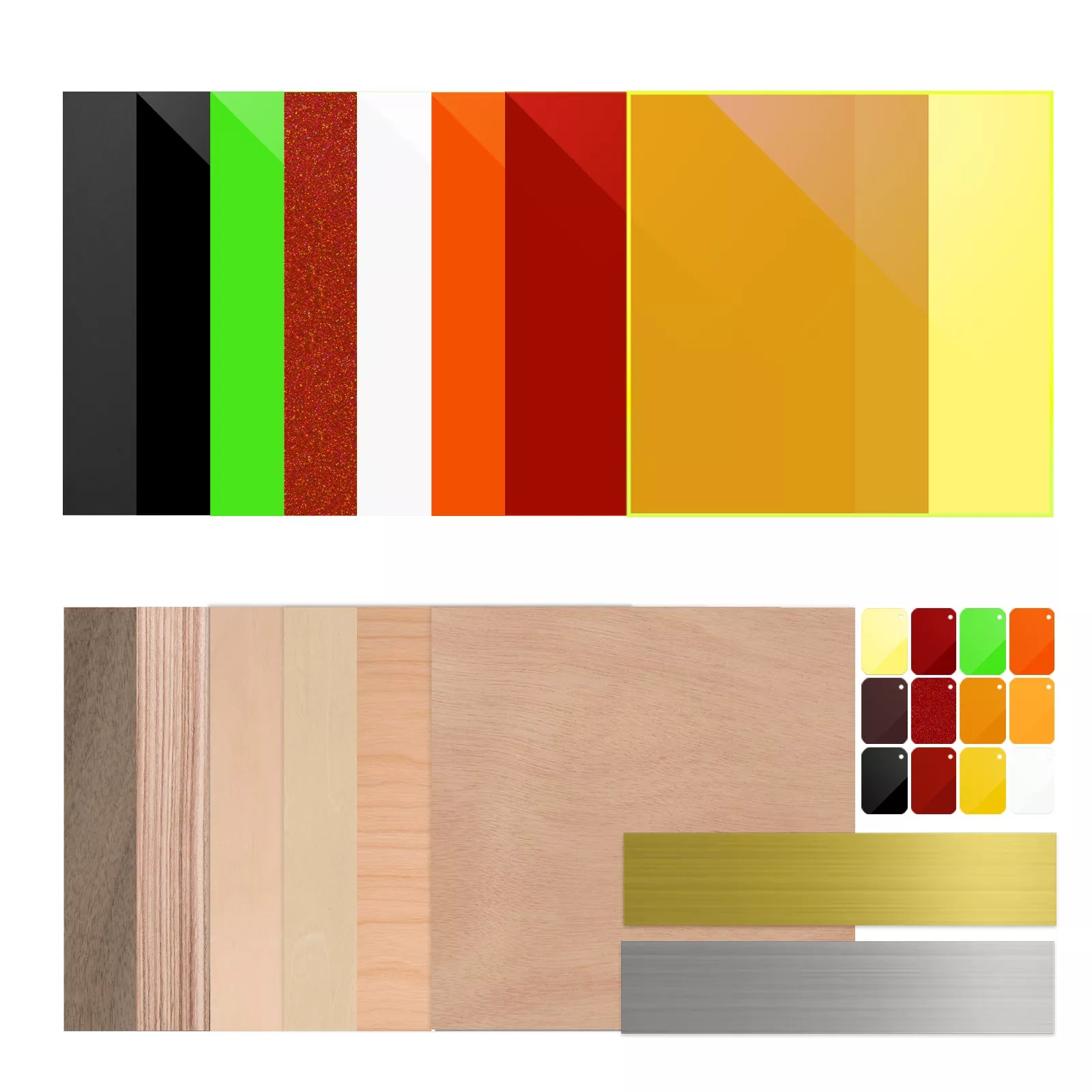 - 必須アイテムの素材パックで、人気の17種類の素材、合計34枚のレーザー素材が含まれています。xTool S1などのレーザーマシンを始めるのに最適です。