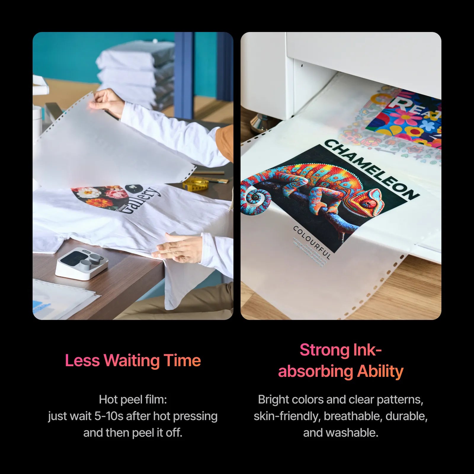 - xTool選定 Apparel Printer 用フィルムロールは、両端にカスタマイズされた穴があり、xTool OS1自動シェイカーオーブン機の搬送トラックに完全に適合します。この設計により、自動ディザリングと乾燥が可能になり、フィルムロールの位置が安定し、作業効率が大幅に向上します。