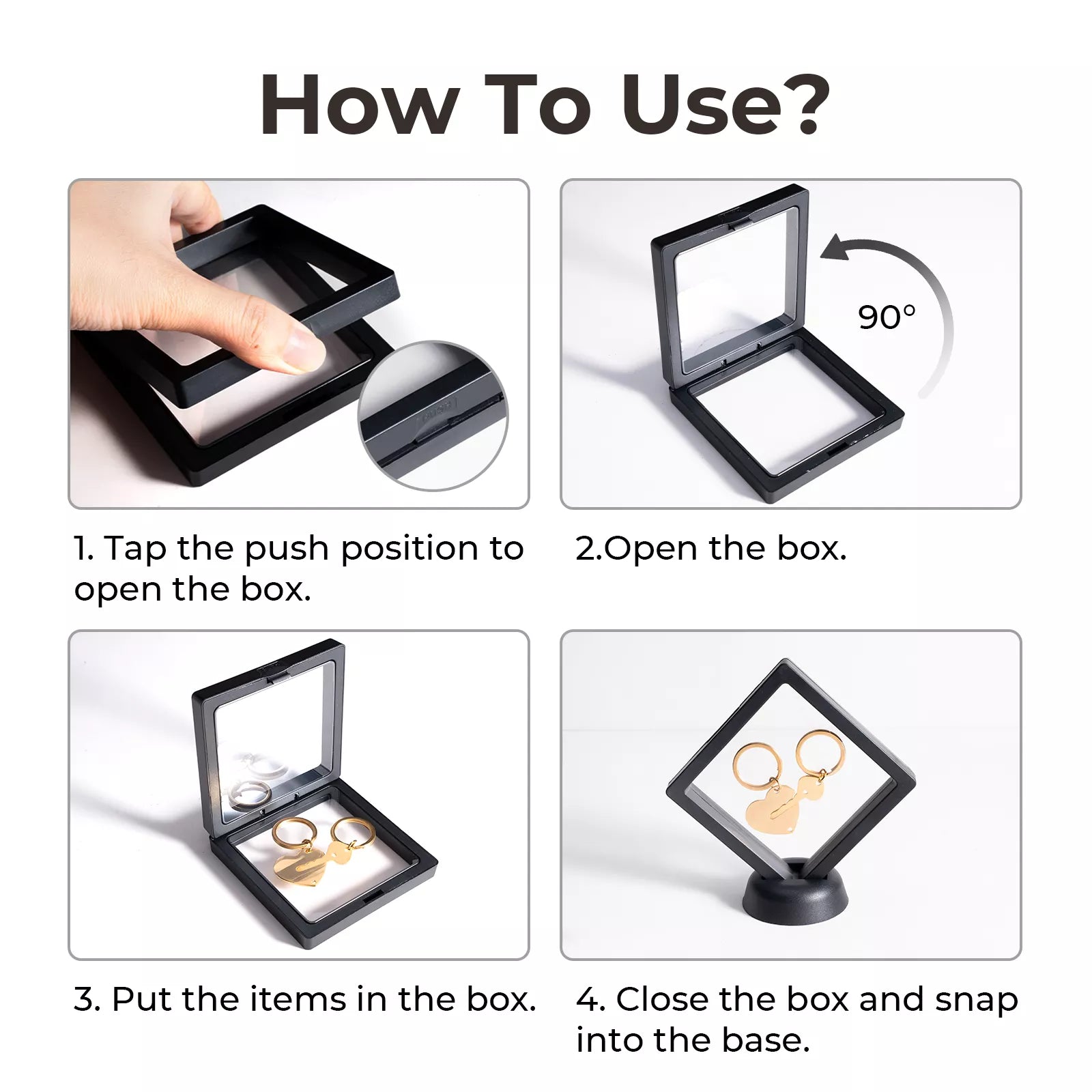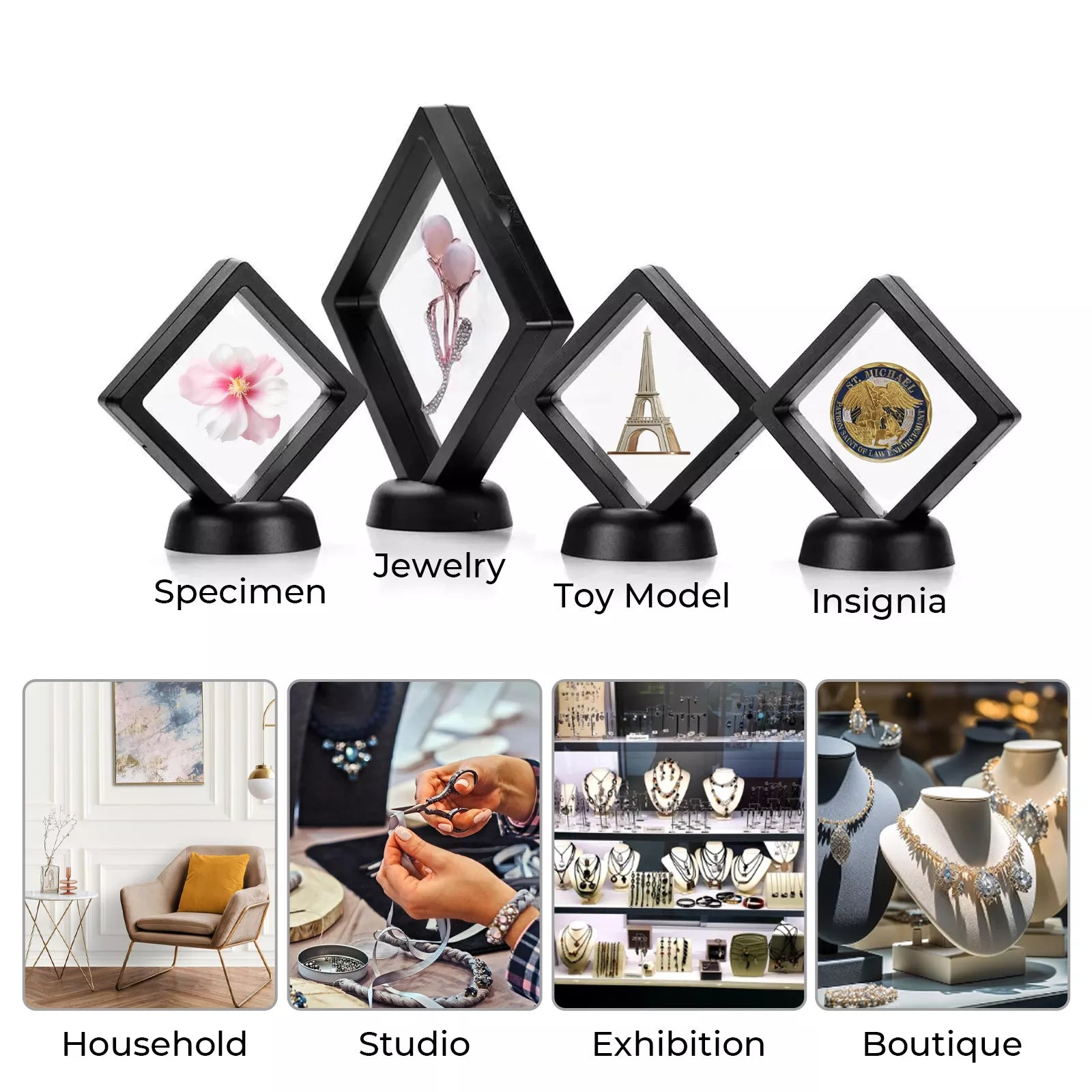 - 展示物は、透明で柔軟なプラスチックフィルム2枚の間に挟まれて、3Dフローティング効果を生み出します。付属のスタンドを使って設置することで、卓上で興味深いディスプレイを演出できます。