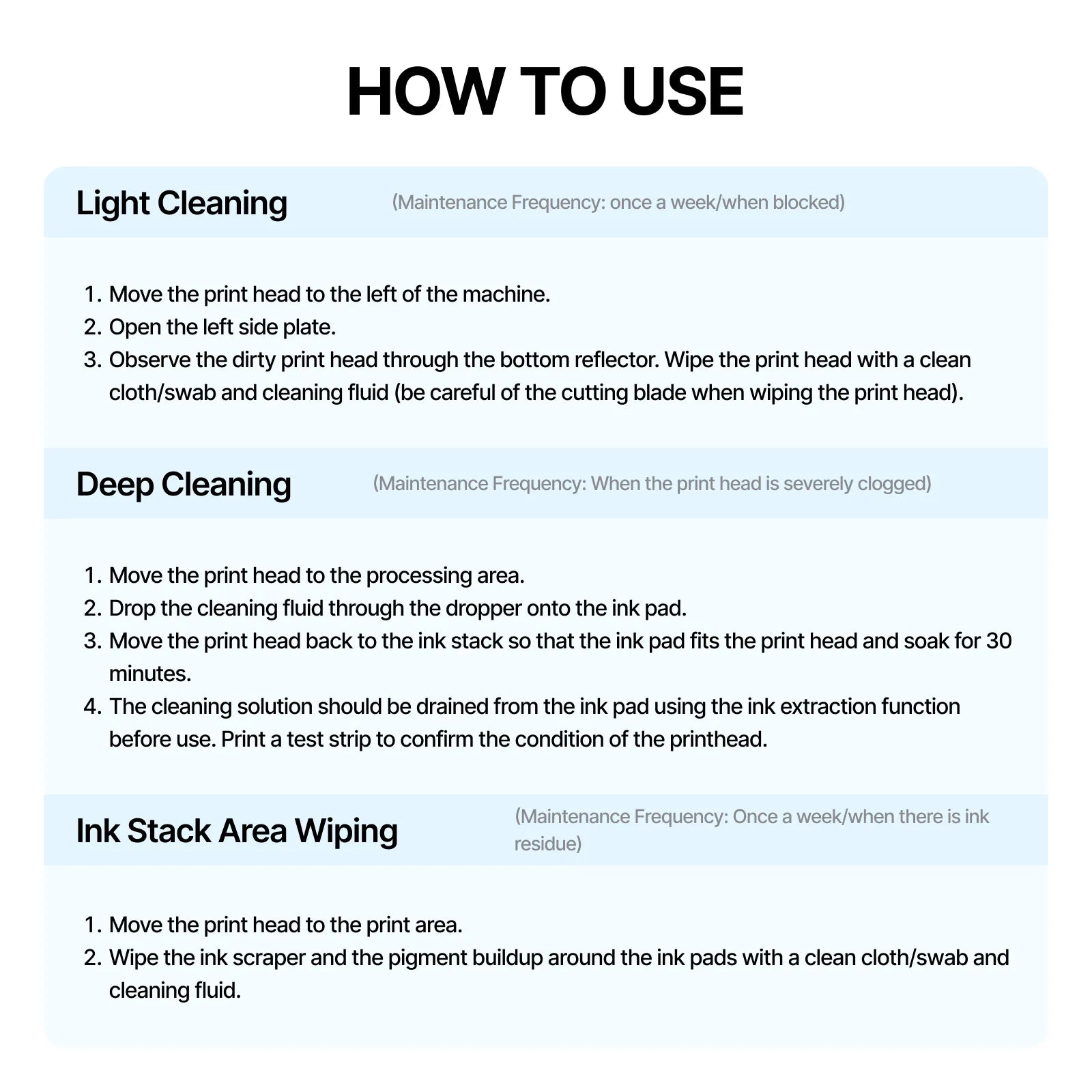 - MSDS(SDS)認証取得済み。xTool Apparel Printer のプリントヘッドの頑固な詰まりや、インクの残留による色の変化、色の印刷不能、画質の低下、印刷中の線などの問題を効果的に解消し、プリンターの性能を最適な状態に回復させます。また、プリントヘッドを保護し、インクの流れをスムーズにし、寿命を延ばします。