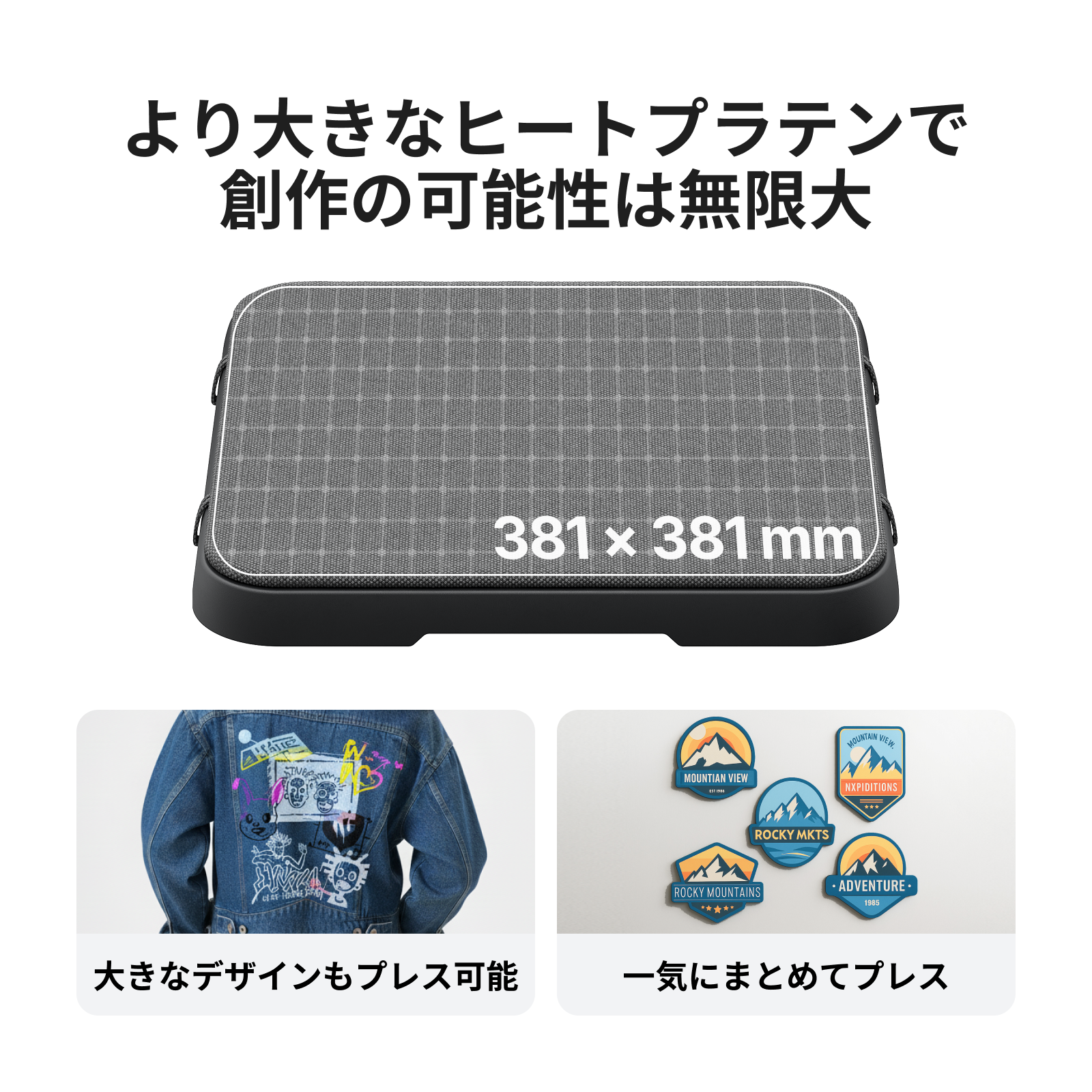 381mm × 381mmの加熱プレートは、XXLサイズの衣類にも対応し、生産能力を向上させます。