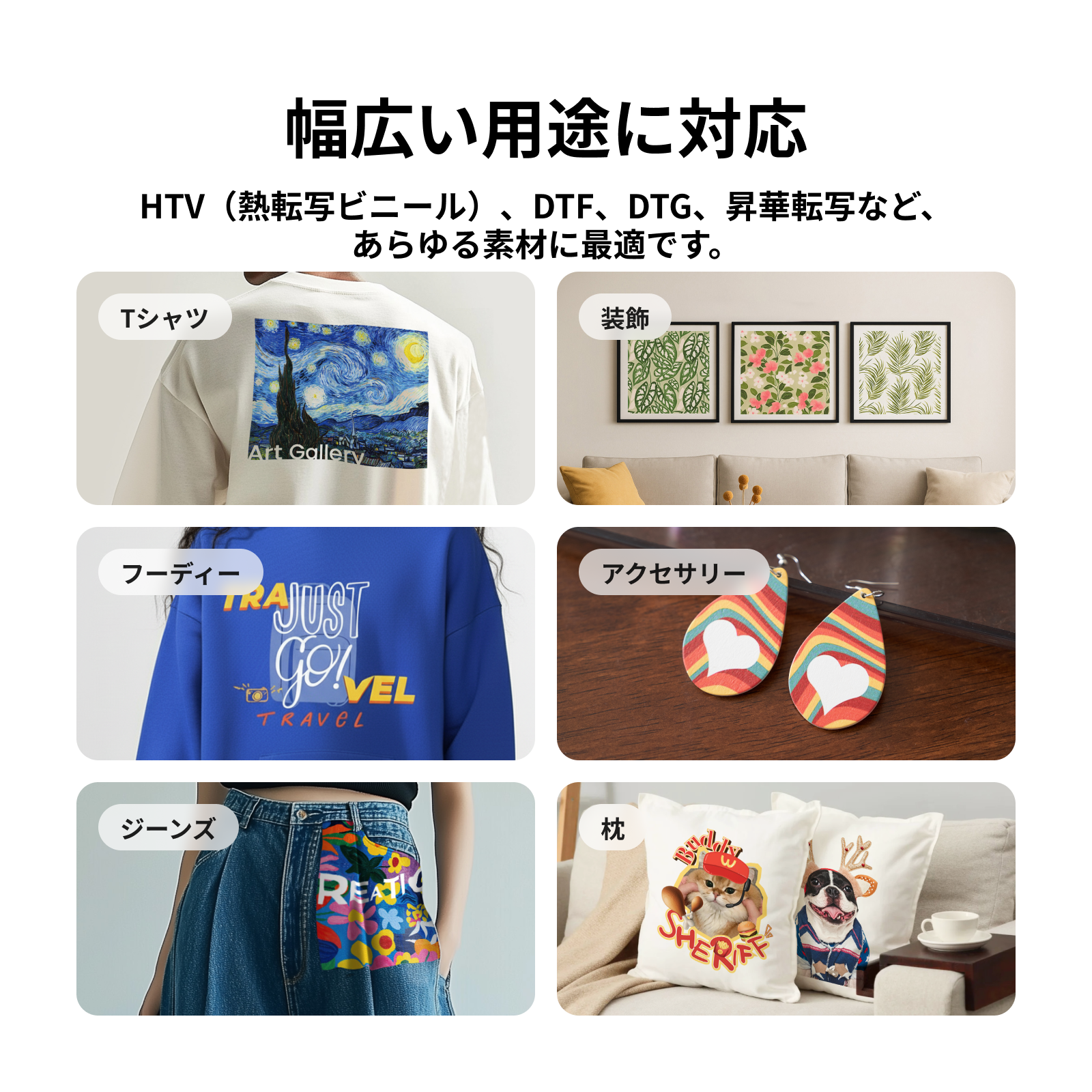 薄手のTシャツから厚手のパーカー、複雑な転写まで、あらゆる素材で完璧かつ安定した仕上がりを実現します。